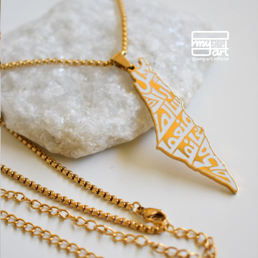 Necklace- Palestine map - Mawtini song lyrics“ هل أراك سالما منعما غانما مكرما ”